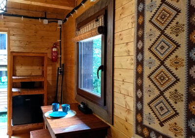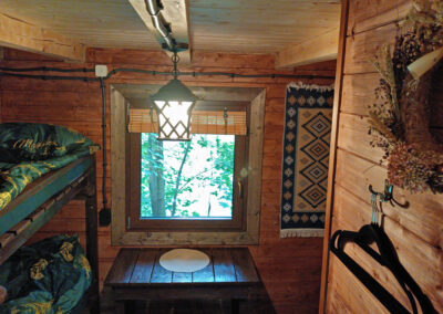 IZBA – to pojedynczy pokój z antresolą sypialną. Mały pokój na parterze mieści łóżko piętrowe i stolik, a na antresoli – dwa miejsca sypialne. W jednym domku mieszczą się dwie izby oraz łazienka, współdzielona między te dwa pokoje.